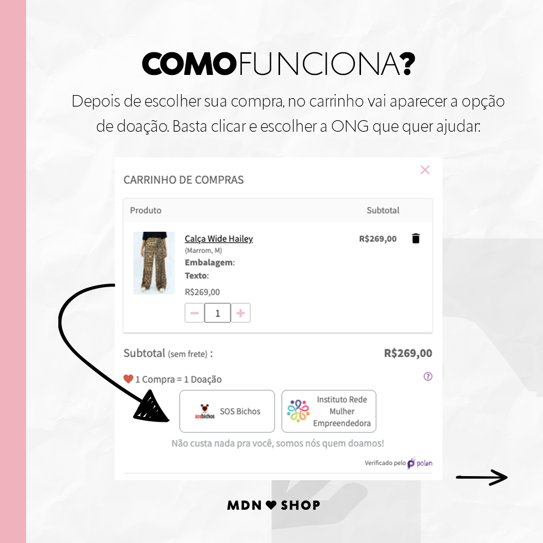 Nós usamos a Pólen como uma intermediadora entre nós e ONGS. Eles possibilitam que vocês façam doações descomplicadas e sem acrescentar nada no valor final da sua compra! Porque esse valor é a Mimos quem paga. Incrível né?